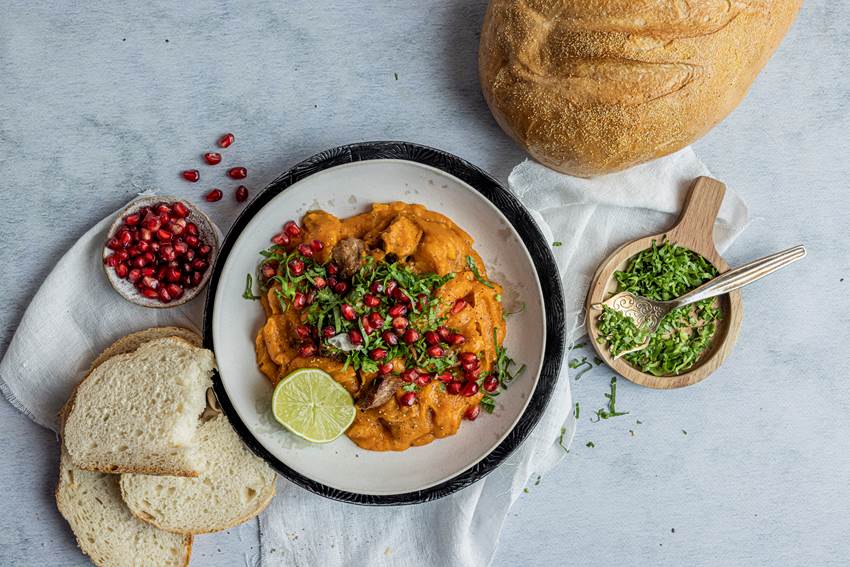 - Topp med finhakket bladpersille og granateplekjerner. Server med gode skiver Gourmetloff.