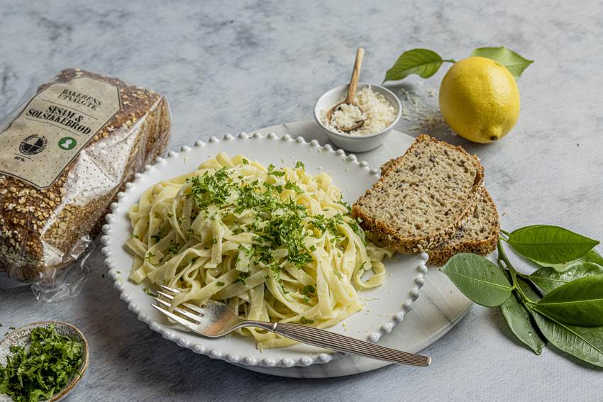 - Bland olivenolje og revet parmesan med revet sitronskall og sitronsaft. Smak til med salt og pepper.