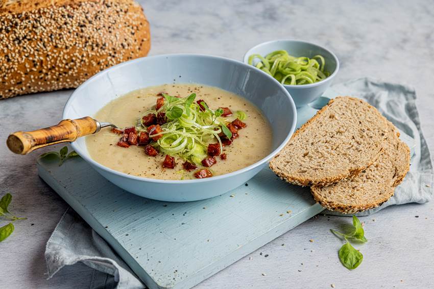 Potet- og purresuppe med Sesam- & Solsikkebrød