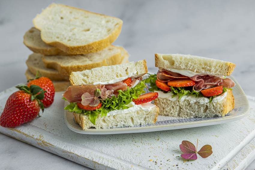 - Legg salat og skinke på to av skivene - topp med jordbær.