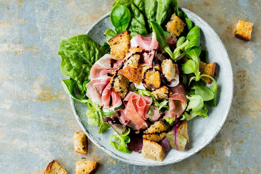 - Start med å blande noen salatblader og tilsett spekeskinke i en bolle. Tilsett hjemmelagde krutonger og litt balsamico for en ekstra god smak, og vips så har du et godt sommermåltid.