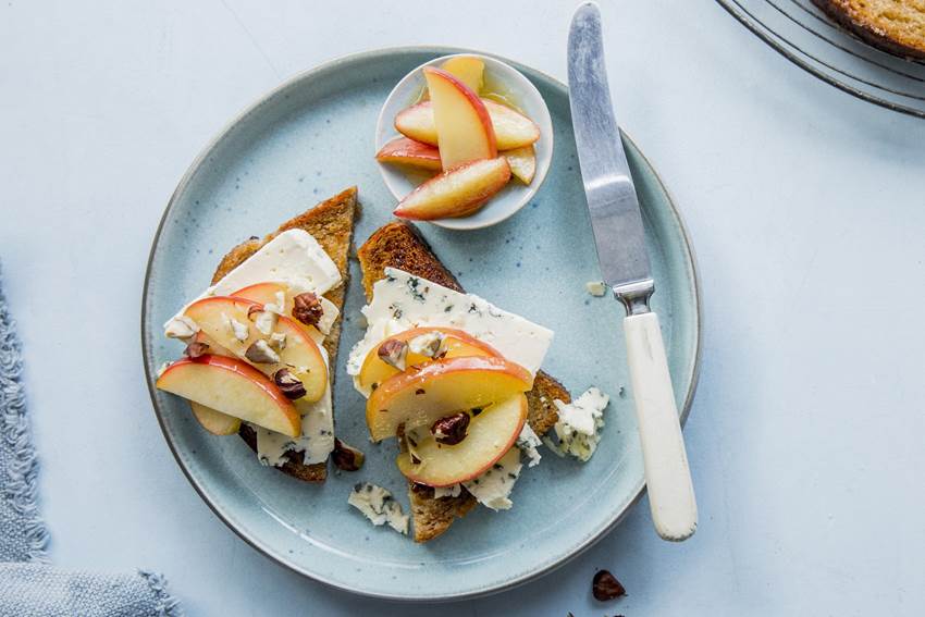 - Skjær noen skiver blåmuggost, legg på skiven og topp med karamellisert eple.