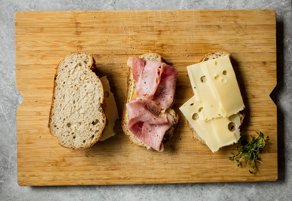 - Legg et par osteskiver og skinke på halvparten av alle brødskivene.