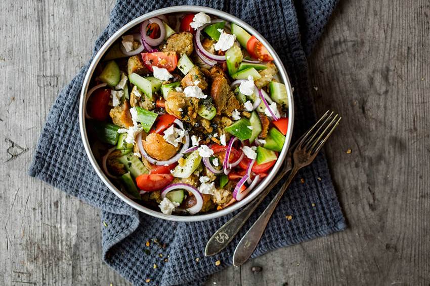 Panzanella er en brødsalat som har sitt opphav i Toscana, Italia. Å lage panzanella er en fin måte å bruke brød som begynner å bli tørt.
