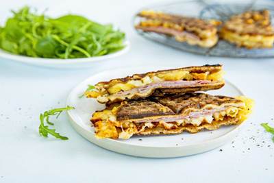 - Trykk sammen delene og stek i vaffeljernet til osten er smeltet og brødet har fått en fin gyllen farge.