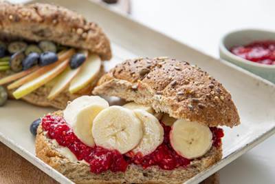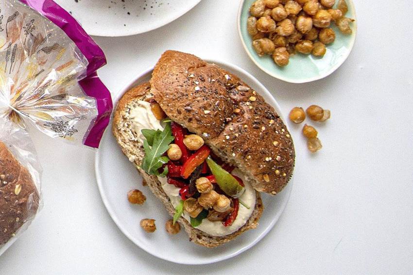 - Del rundstykke og smør på hummusen.