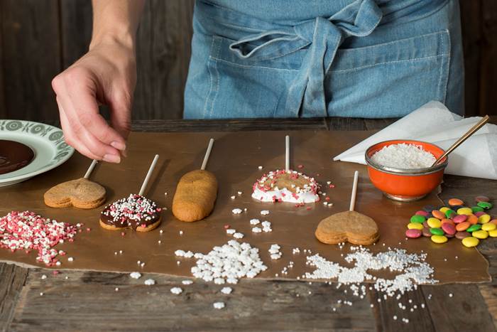 - Stikk ut hjerter av pepperkakedeig, legg to og to sammen med en pinne imellom før steking.