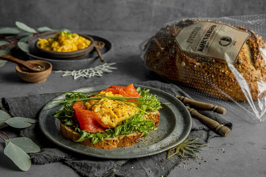 - Start med salat, fortsett med laks og avslutt med myk eggerøre og gressløk.