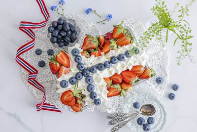 - Fordel jordbær, kremfløte eller yoghurt, og blåbær i striper på vaflene.