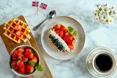 - Pisk krem av fløte sammen med sukker og vaniljesukker og legg på det hvite i flagget.