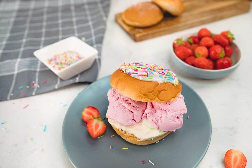 Legg på litt krem i bunnen av hvetebollene og topp med iskremkuler og hvetebolletoppene.