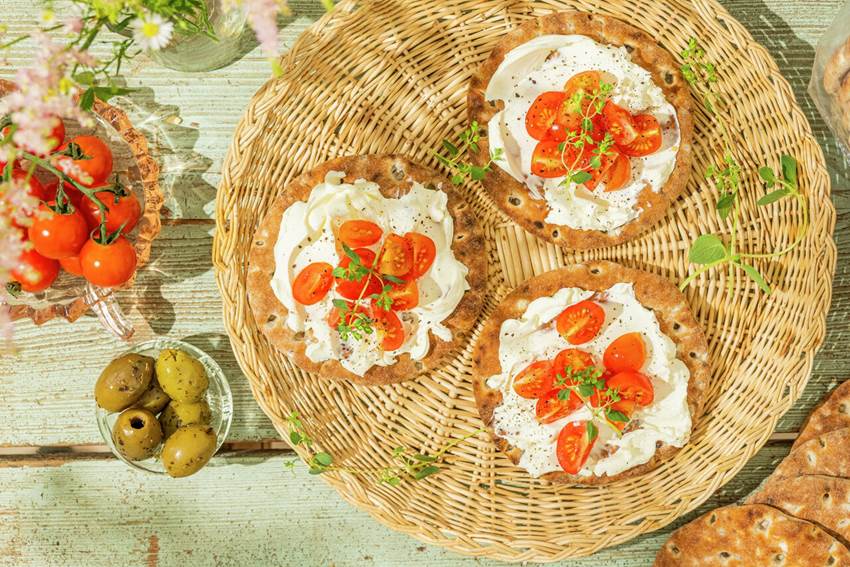 Smør Myk & rund med smøreost og legg tomater kuttet i to på topp.