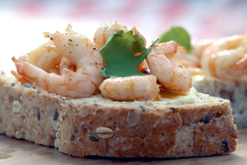 - Del brødskivene i to, legg på litt aioli og reker på toppen