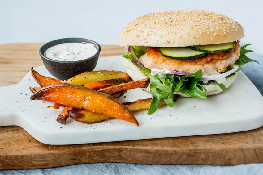 - Del burgerbrødet i to, legg et salatblad i bunn og smør deretter rømmedressing på salaten. Legg noen ringer med rødløk på, fiskekaken og skiver av squash. Til slutt legger du burgerbrødet på toppen. Voilà – og du har en deilig fiskeburger!