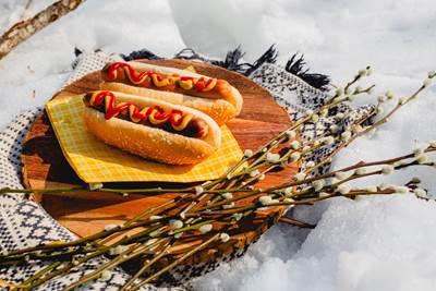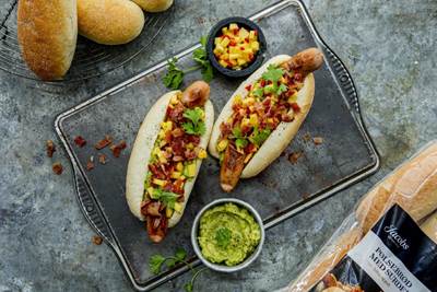 - Server pølser med frisk coleslaw og sprøstekte baconterninger. Topp gjerne med friske urter.